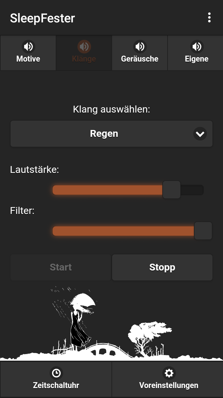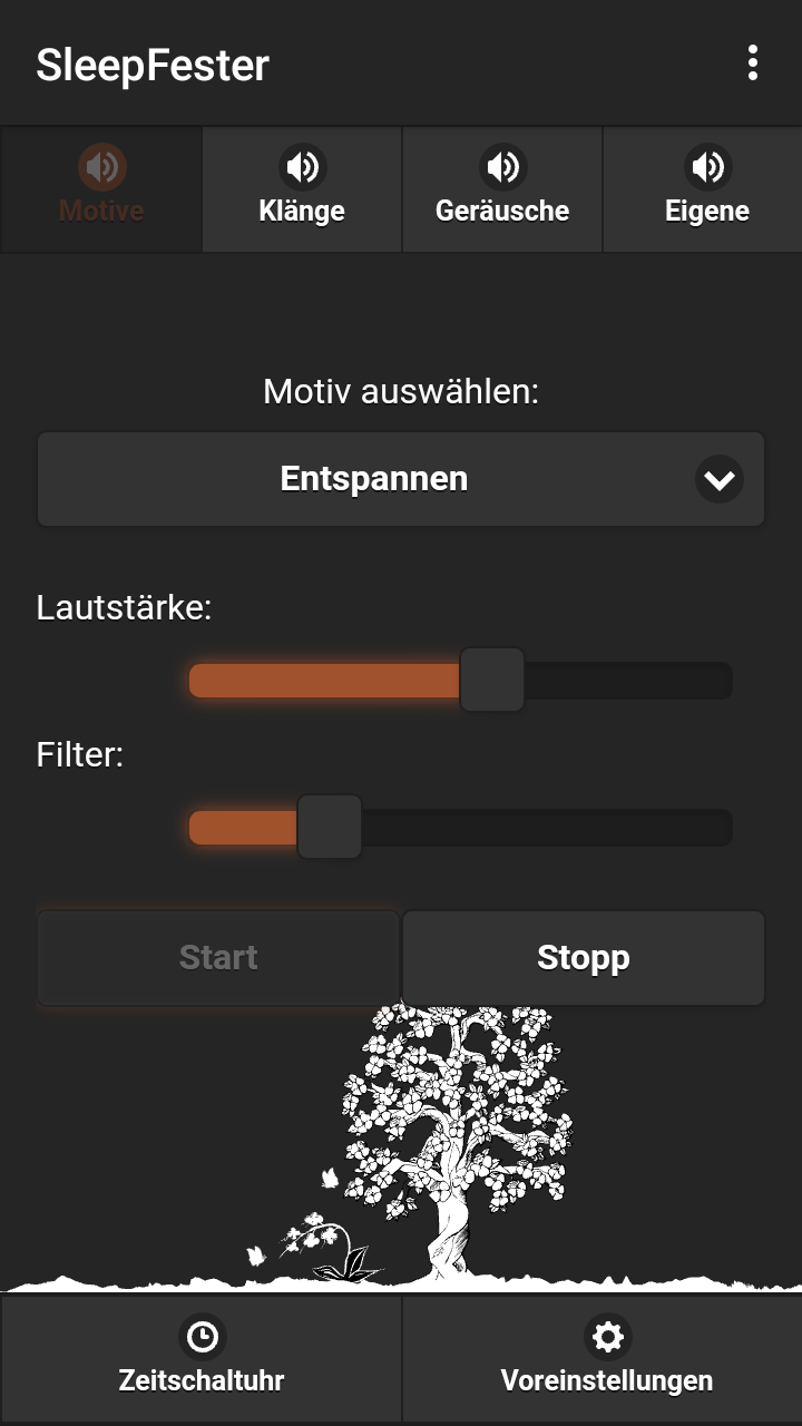 Alle Klänge können mit Hilfe einer Zeitschaltuhr ausgeblendet werden. Um eine optimale klangliche Wiedergabe aller Frequenzspektren zu gewährleisten, ist es sinnvoll das Smartphone/Tablet an einen Verstärker, Lautsprecher oder ein ähnliches Wiedergabesystem anzuschließen.